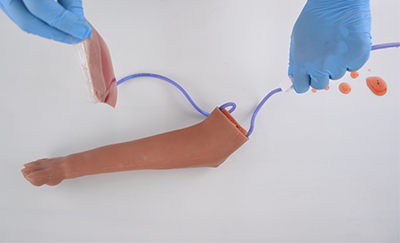 - You can detach the fake dog skin and check if fake blood is clogged in the tip of leg core. If yes, please trim the curved sections of the leg core tip slightly to ensure the tubing (veins) doesn’t get pinched or squeezed.
