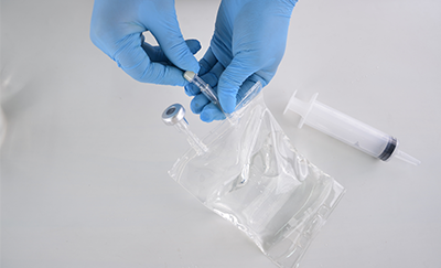 2. Fill 60ml syringe with fake blood. Use 60m syringe to inject fake blood into 100ml fluid bag. When connecting syringe with fluid bag, make sure to screw the syringe onto the IV bag connector tightly using the threaded design to prevent any leaks.