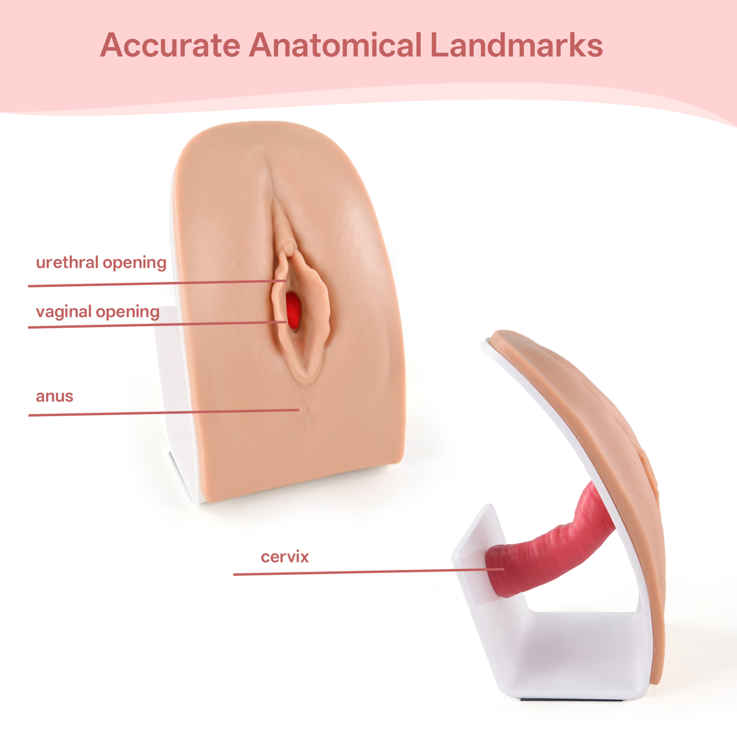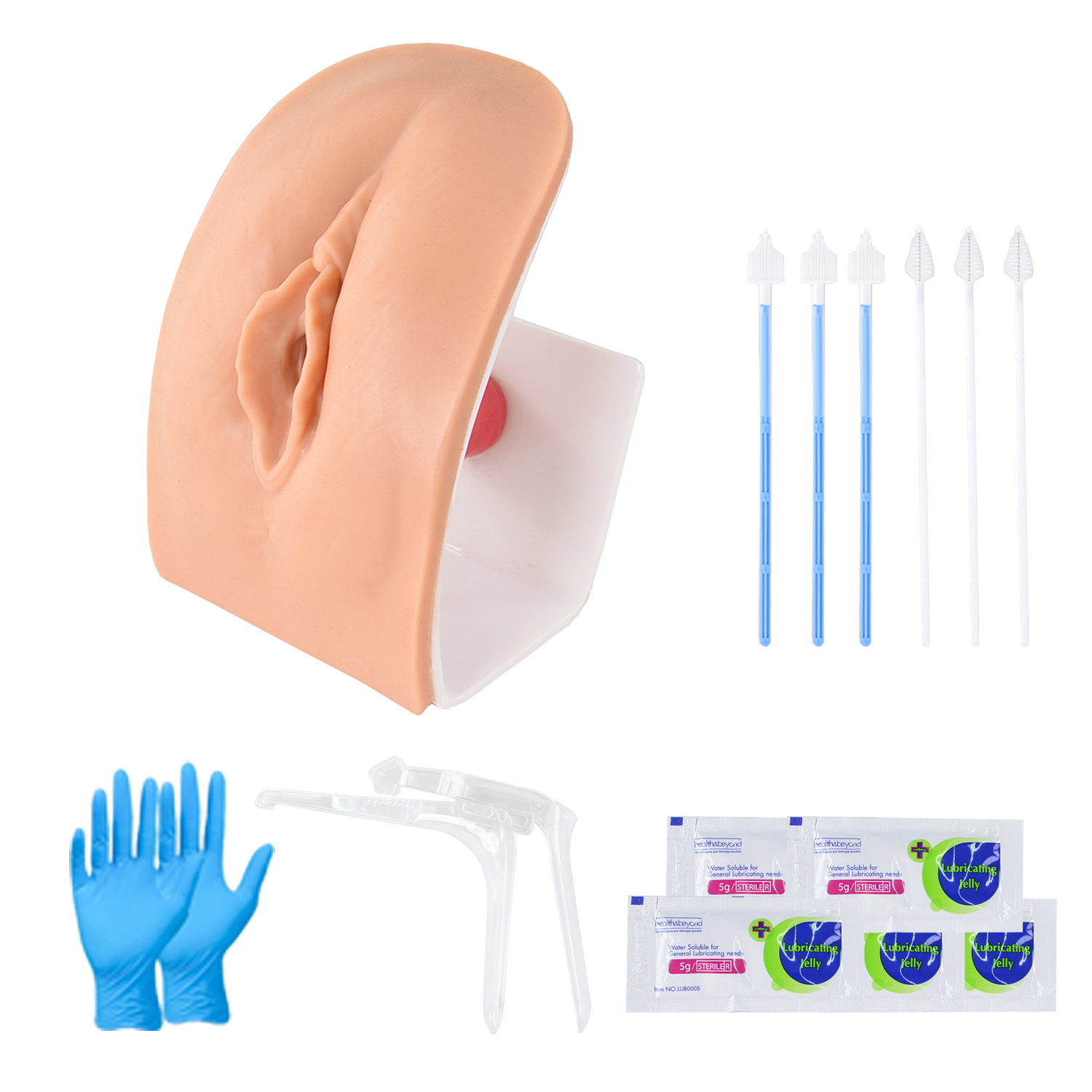 The pelvic examination model with simplistic design allows user to practice vaginal and cervix examination. The model includes anatomically accurate structure of vagina opening, vagina and cervix. User can use speculum to examine the vagina and cervix on the model. Realistic feature and soft skin.